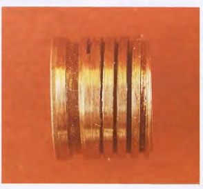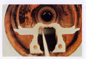 Determine the cause of restriction of oil to the bushing. Example shown: a piece of debris entered the lubrication system, blocking the oil flow.