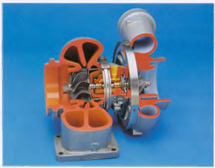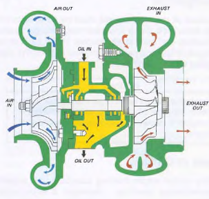 How a Turbocharger Works The heat energy and pressure in the engine exhaust gas is utilized to drive the turbine wheel. The speed of the rotating assembly and output of the compressor wheel is controlled by the design and sizing of the turbine housing. The housing acts as a nozzle to direct the exhaust gas flow to the turbine wheel blades which, in turn, drive the compressor. Clean air from the air cleaner is drawn into the compressor housing and wheel where it is com pressed and delivered to the charged air cooler and then to the engine air intake manifold. The amount of air pressure rise and air volume delivered to the engine from the compressor outlet is determined by wheel size, housing size, and performance matching of the turbocharger to a given engine. Each engine size must be properly matched.