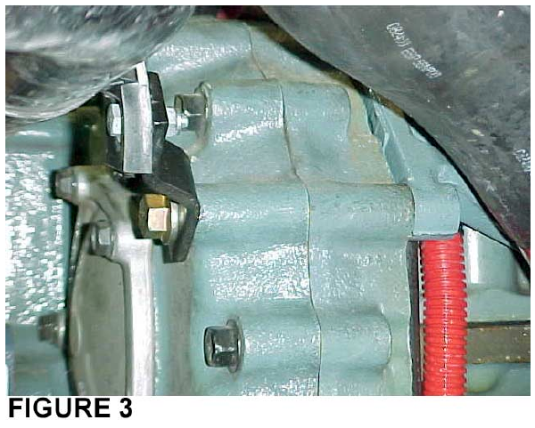 The procedure is the same as the above except there is no need for the breather tube clip and clip bracket attachments when installing the right side stabilizing bracket. Also, there is no crossover pipe and attachment bracket on the left side of the engine. Therefore, you simply use the two (2) new bolts, 23528812, supplied in the kit for attaching the bracket to the gear case/cover as show in figure 4.